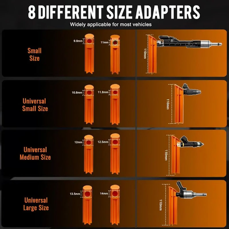 EINFACHE EINZELPRÜFUNG – Isolieren Sie problematische Einspritzdüsen schnell, indem Sie sie einzeln prüfen. Dieser unkomplizierte Vorgang hilft Ihnen, Fehler wie Undichtigkeiten oder Verstopfungen zu lokalisieren, und spart Ihnen wertvolle Zeit und Mühe bei der Diagnose, ohne dass komplexe Verfahren erforderlich sind.
