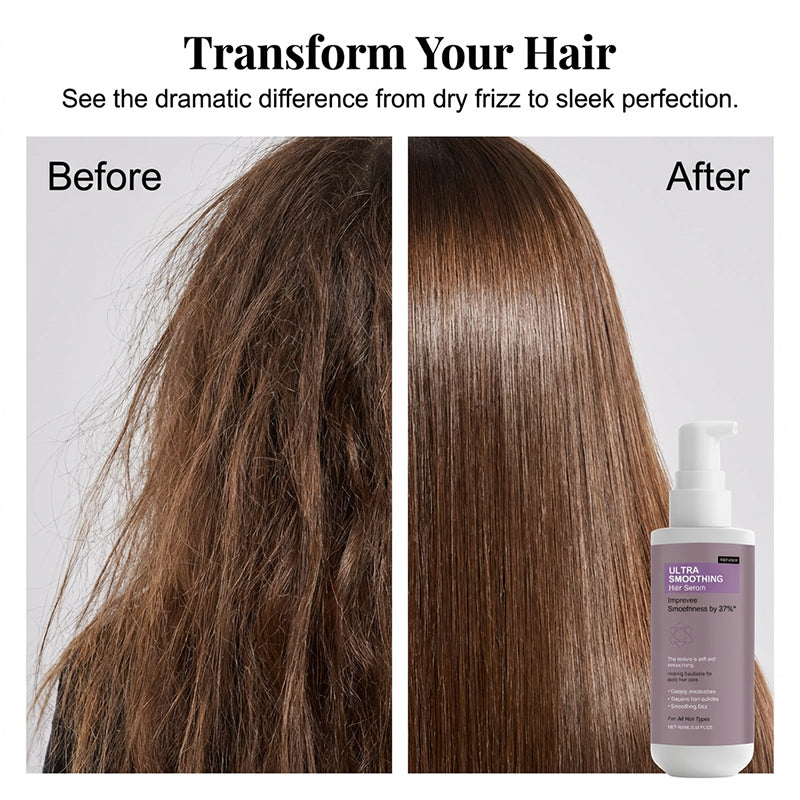 Verwandeln Sie Ihr Haar – erleben Sie eine dramatische Verwandlung schon nach der ersten Anwendung. Vergleichen Sie Ihr trockenes, krauses Haar vorher mit Ihrem geschmeidigen, perfekt glatten Haar nachher und überzeugen Sie sich selbst von der wahren Kraft unseres Serums.